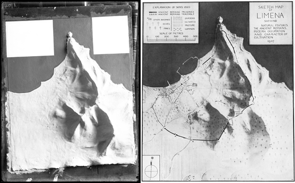 Left: BSA SPHS 01/0389.1702. Thasos, Limenas: Model of Mountain System lighted from East. Right: Annotated image of the model showing current state of Limenas, both modern and ancient in relation to natural features. (Penoyre 1909: pl. XIV).