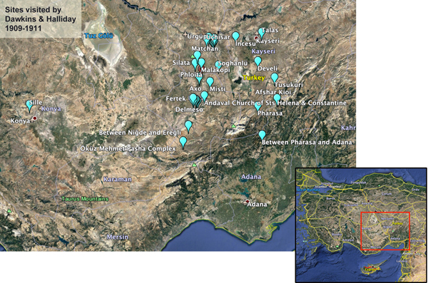 Many of the villages visited by Dawkins and Halliday changed names after the Treaty of Lausanne and the exchange of population in 1923. Some villages ceased to exist. However, the name changes are well documented and it is possible to plot them on a modern map.