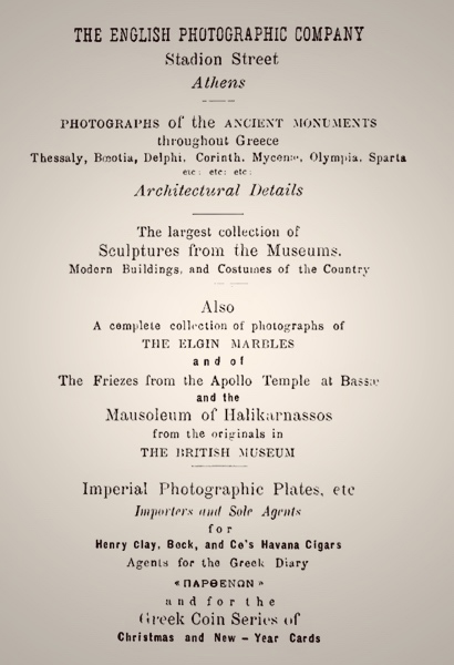 Five years later, in 1905, the company appears again in 3rd English edition of the Baedeker Handbook to Greece. However, at this point, it mentions that photographs from the English Photographic Company, associated with the name J.K. Atchley, were sold in the shop of Charles Beck, a well-known bookseller in Athens.