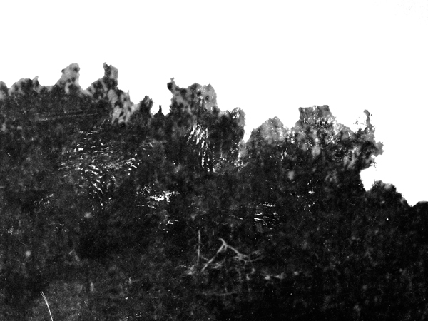 The negatives in the SPHS collection also provide evidence that this was a working collection consisting primarily of copy negatives as demonstrated by the evidence of retouching. This can be seen in comparing the two photographs of the Vale of Tempe above: the English Photographic Company image as been retouched, producing a uniform white sky compared to the variations in grey seen in the original negative by Atchley. Another example of retouching can be seen in the treetops of the photograph of Tatoi (BSA SPHS 01/4491.9245 below). Painting over the sky to remove imperfections such as fingerprints and dust particles that occur on a negative when being copied was a common technique. This example shows where the retouching roughly followed the line at the top of the tree, not fine enough to cover all the sky shown through the leaves and branches as you can see in the enlarged section below where remains of a fingerprint can also be seen.