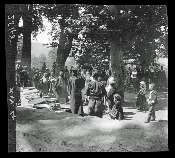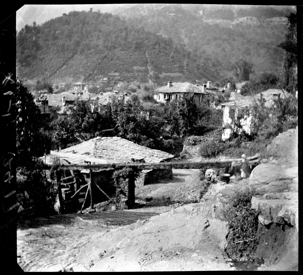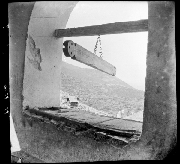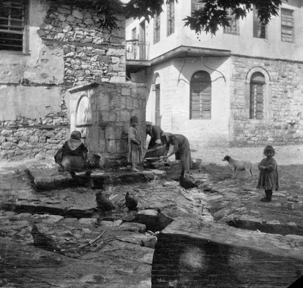 Penoyre also observed everyday life among the villagers of Thasos which he captured with his camera. In the image of the village of Potamia, Penoyre shows the watercourse, part of a waterwheel and roofed space for for the village ‘hammer mill’ style clothes washing facility in the foreground with the village behind. From the photograph of the lower spring at Panagia, it is apparent the women, surrounded by chickens, children and a dog, are collecting water in pots although this activity is not reflected in its caption. At Maries, Penoyre photographed a wooden semantron, a percussion instrument used in the Eastern Orthodox church, perhaps as curiosity. At Bulgaro (modern Rachoni), he captured the blessing of food for a festival from a position outside the activity. Taking ethnographic images – consciously or unconsciously – was not an uncommon occurrence by such Western observers. Although the objects or activities portrayed often played little part in their subsequent discussion of antiquities – the primary purpose of their fieldwork or travels.