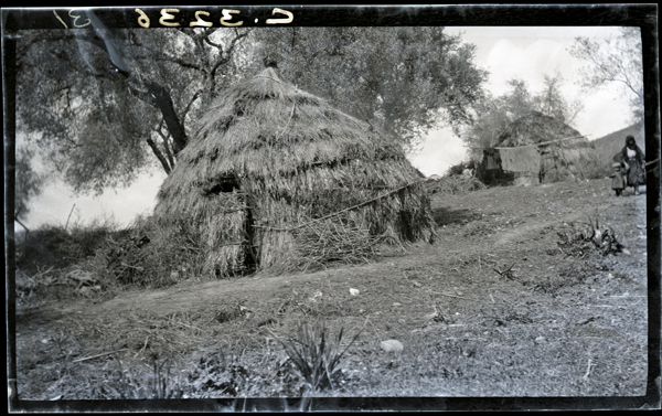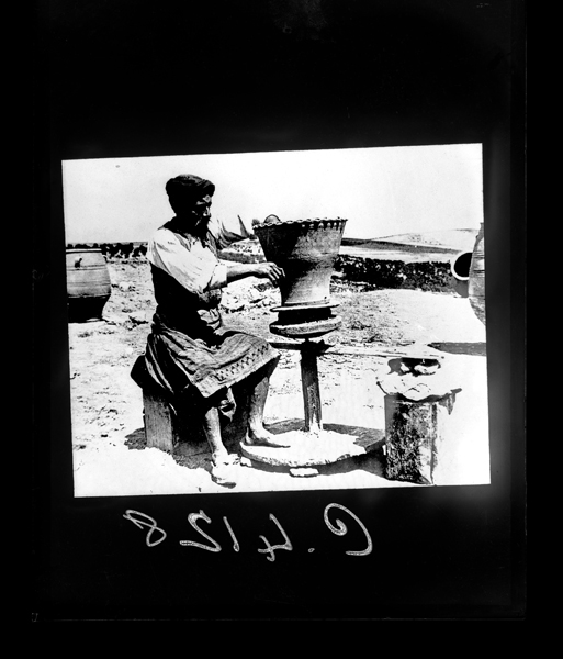 Miss Skeat and Miss Rutherford, on the other hand, might fall into the sociological-anthropological category. It is clear that both Miss Skeat and Miss Ruterford intentionally photographed or collected specific ethnographic subjects with no antiquities in view. Yet, they also photographed ancient monuments devoid of or mitigating modern life such as in the images above showing Miss Skeat’s photograph of Tiryns with visitors disappearing down the passage and Miss Rutherford’s view of the temple at Stratos. The 5 glass negatives donated by Miss Skeat were most likely acquired by her from commercial sources and consist of scenes of domestic activity and pottery production: ancient and modern storage jars side-by-side, a drawing of an outdoor baking oven, a travelling Cretan potter at work, a modern pot market at Chalkis in Euboea and a modern pottery workshop. Miss Rutherford appears to have been interested in people she encountered – some engaged in activities, and others simply posed. Both sought to capture the present they encountered, the “otherness” of the people particularly identified by native costume, and reflected activities with past practice.