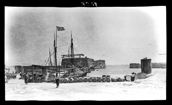 The Annual Report for the 1912/1913 session mentions that Halliday, who was now Lecturer in Greek at the University of Glasgow, returned to Greece to participate in the Kamares Cave Excavation which was directed by Dawkins in the summer of 1913. After the excavation, Halliday took advantage of the opportunity to travel to parts of Crete recorded in 12 photographs in the SPHS collection. One photograph shows a church with rope binding around it, explained in his article in Folklore on this particular superstition. Binding churches, as Halliday explained, was a common practice in Greece “when a village is devastated by an epidemic, to vow a binding of the church or churches with wax candles. The thin wax candles are knotted together and tied round the church as in the photographs. For any serious epidemic spiritual help may be invoked in this way…”. Another photograph shows a ship at Heraklion (Candia) harbour bearing the Greek flag, a reminder that Crete had recently been incorporated into the Greek state. Although his time was short in Crete, Halliday’s travels may have served him well during WWI when he was stationed in Crete as an Intelligence Officer from 1916 to 1918.