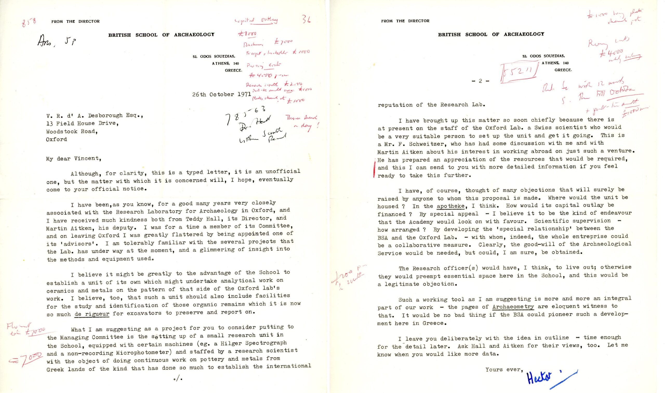 In a letter to Vincent Desborough[4] as the chairman of the BSA Managing Committee, on 26th October 1971 he suggested the school “establish a unit of its own which might undertake analytical work on ceramics and metals… such a unit should also include facilities for the study and identification of those organic remains which it is now so much de rigueur for excavators to preserve and report on.” This letter lays out Hector’s intentions clearly and the immediacy of it shows how important this project was to him.