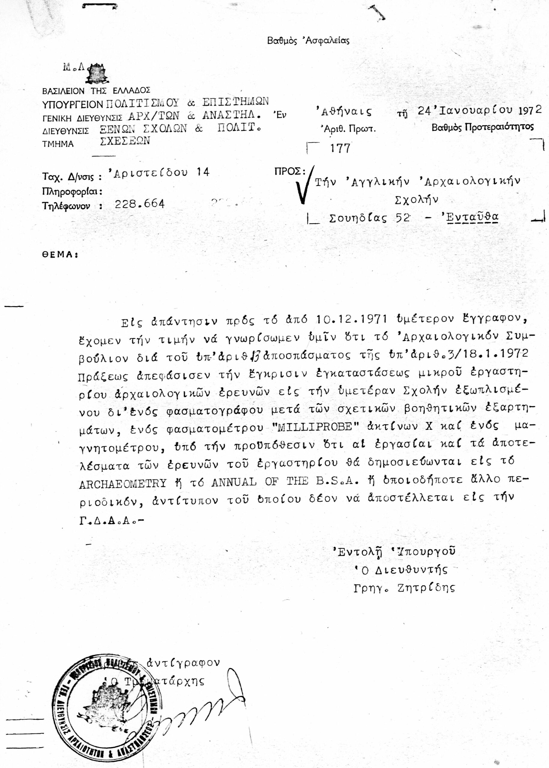 Luckily, with a vote of 9 in favour and 3 against, most of the Managing Committee were in full support of the Mini-Lab project and soon planning, with guidance from Teddy Hall and Martin Aitken, began. Letters and proposals were sent to the Archaeological Service in Greece for permission to set up such a project, and on the 24th January 1972, permission was granted!