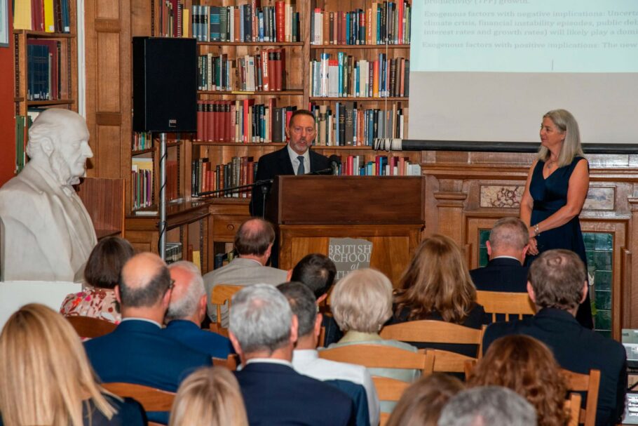 The Director showcased the School’s diverse range of activities and academic initiatives, highlighting current projects at the Fitch Laboratory, the BSA Arts Bursary, and the hosting of the inaugural Michael Marks Foundation poets in residence, alongside its current fieldwork projects in Knossos and Keros. Another focus was the BSA’s current development priorities, including modernising digital infrastructure, digitising its archives and endowing staff positions, building on the successful fundraising campaign to construct a new Stratigraphical Museum at the BSA’s Knossos Research Centre, thanks to a transformative gift from the Packard Humanities Institute. Ambassador Lodge provided an insightful overview of UK-Greek collaborations and highlighted how the BSA serves as an essential institution promoting research and collaboration between the UK and Greece. The Chair of Council gave the closing remarks, thanking the Governor for his insights and giving praise for his understanding of Greek history, which informed the steady steering of the financial ship of state through the turbulent waters of recent years. The Governor’s lecture provided great inspiration to the business leaders in attendance and to the School towards securing its own future.