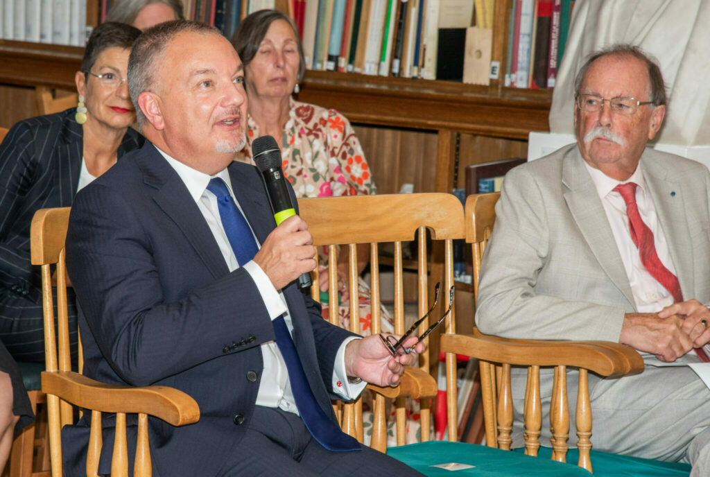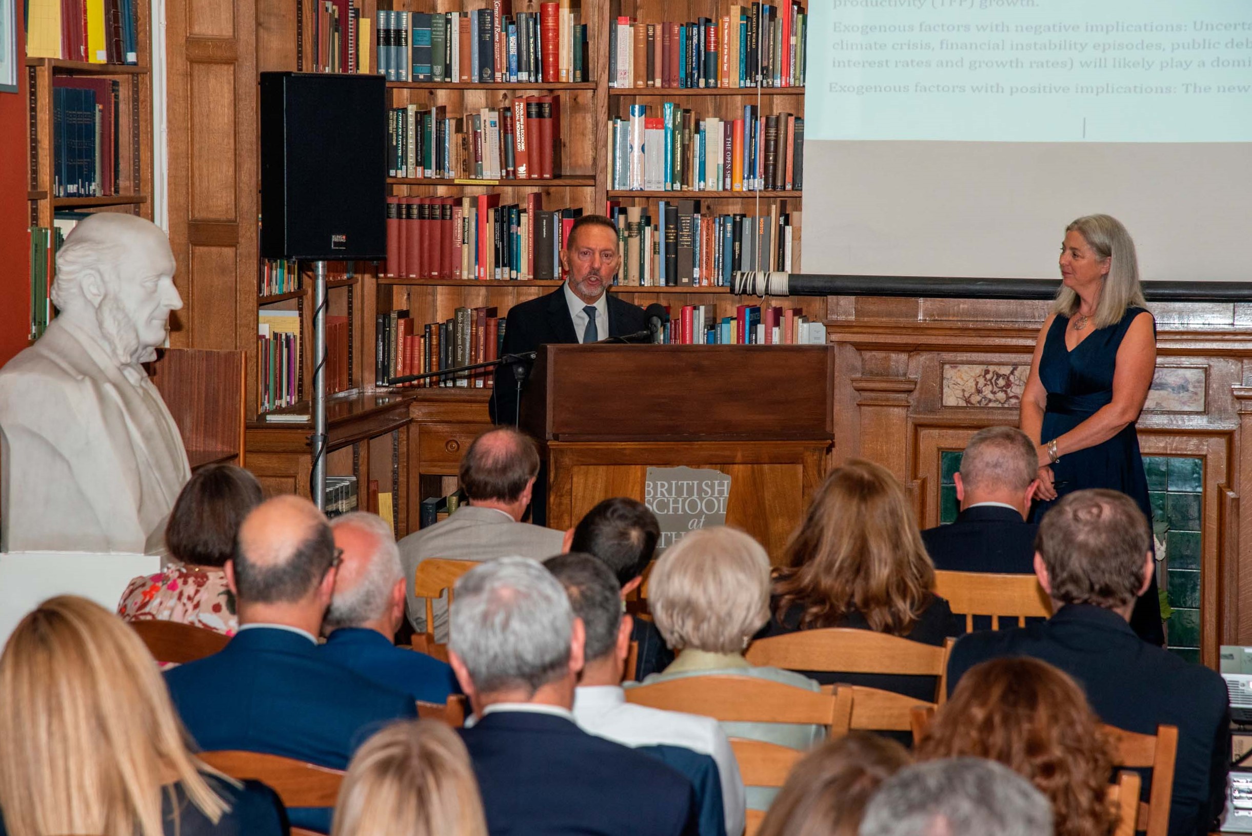 On Thursday 3 October 2024, the British School at Athens was honoured to hold a special evening with the Governor of the Bank of Greece, Professor Yannis Stournaras. The lecture, held in the atmospheric surroundings of the BSA library, was hosted by the Chair of Council, Professor Sir Roderick Beaton, and the Director, Professor Rebecca Sweetman, in the presence of His Majesty’s Ambassador to the Hellenic Republic, Matthew Lodge.