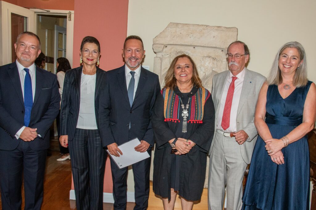 - left to right: HMA Matthew Lodge, Lina Nikopoulou, Yannis Stournaras, Mahi Georgakopoulou, Sir Roderick Beaton, Rebecca Sweetman