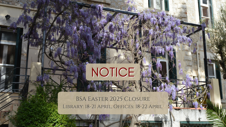 Easter Closure 2025 April 11, 2025 Καλό πάσχα! Happy Easter! Please note: The BSA Library will be closed 18-21 April (inclusive) The BSA Offices will be closed 18-22 April (inclusive) May 14, 2025