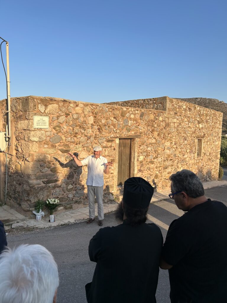 The Abbott of the Toplou monastery began the celebration with a trisageion blessing at the Aghios Antonios chapel. After the service, Nikos Hatzidakis, mayor of Palaikastro and former digger on the School’s excavations there, and Giorgos Zervakis, mayor of Sitia, unveiled the marble plaque and gave speeches about Hugh’s contribution to illuminating the region’s history. Dr Sandy MacGillivray, one of Hugh’s co-directors of the Palaikastro excavations, and Anthoula Veniamaki of the Hellenic Ministery of Culture, shared personal memories of Hugh’s work at Palaikastro.