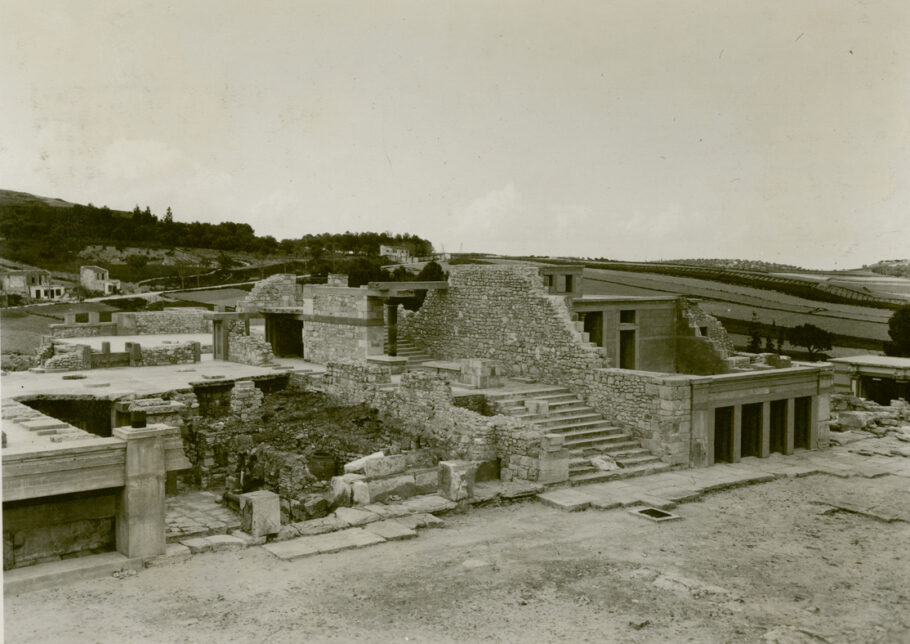Photo caption: The facade for the West Wing of the palace at Knossos looking from the central court. Photo 1930-1931. (© John Pendlebury Family Archives, British School at Athens, Archive, PEN 7/2/5/011)