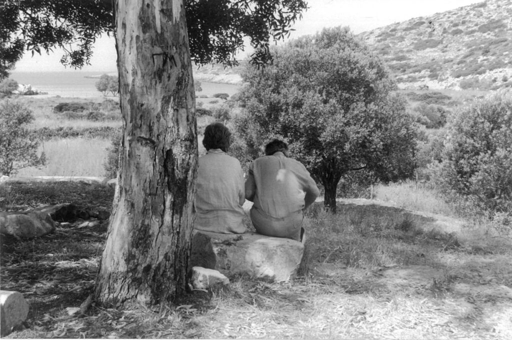 - Richard and Heather Tomlinson seated on an ancient ashlar block, looking out over the bay at Kato Phana in 1997 (image courtesy of Lesley Beaumont)