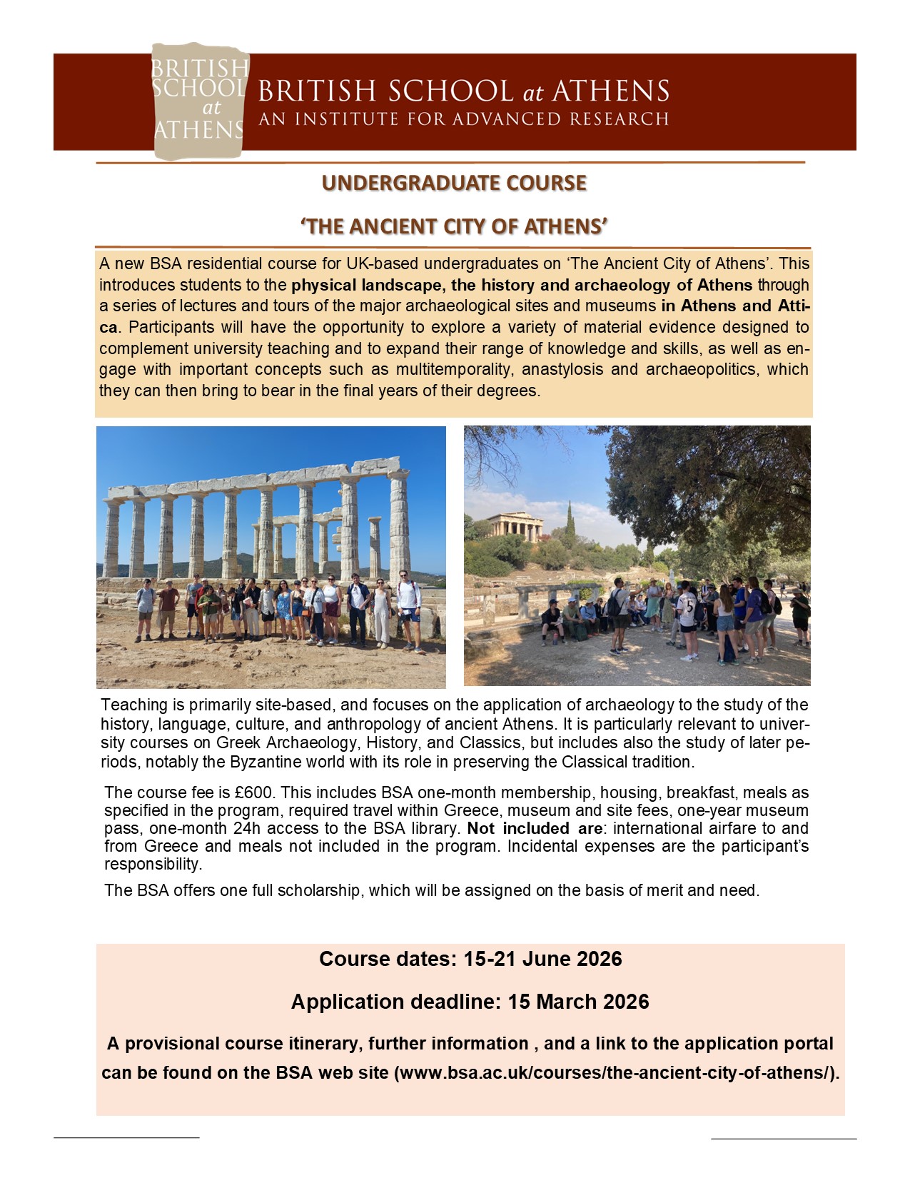 The course is £600 and includes accommodation where self-catering facilities are available, breakfast, meals as specified in the program, required travel within Greece, museum and site fees, one-year museum pass, one-month 24h access to the BSA library. Not included are: international airfare to and from Greece and meals not included in the program. Incidental expenses are the participant’s responsibility.