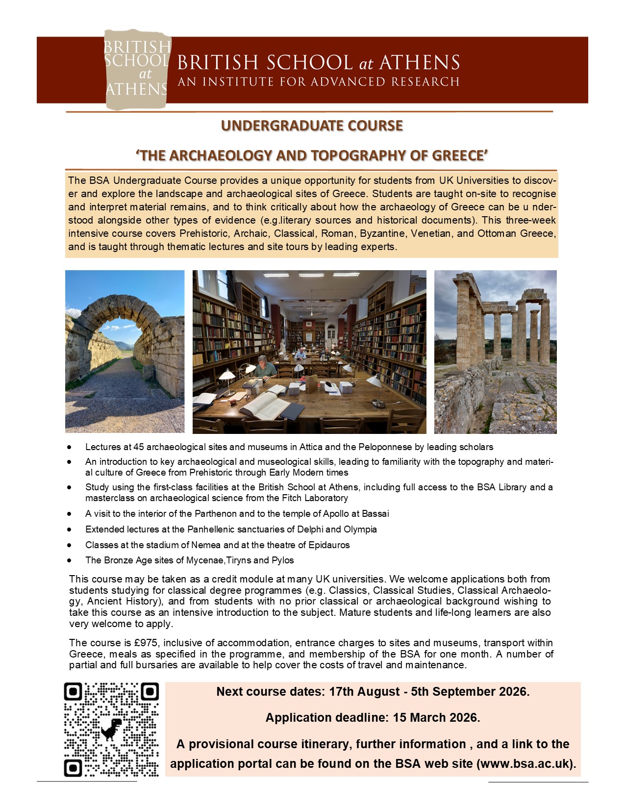 The course fee is £975. This includes BSA one-month membership, housing, breakfast, meals as specified in the program, required travel within Greece, museum and site fees, one-year museum pass, one-month 24h access to the BSA library. Not included are: international airfare to and from Greece and meals not included in the program. Incidental expenses are the participant’s responsibility.