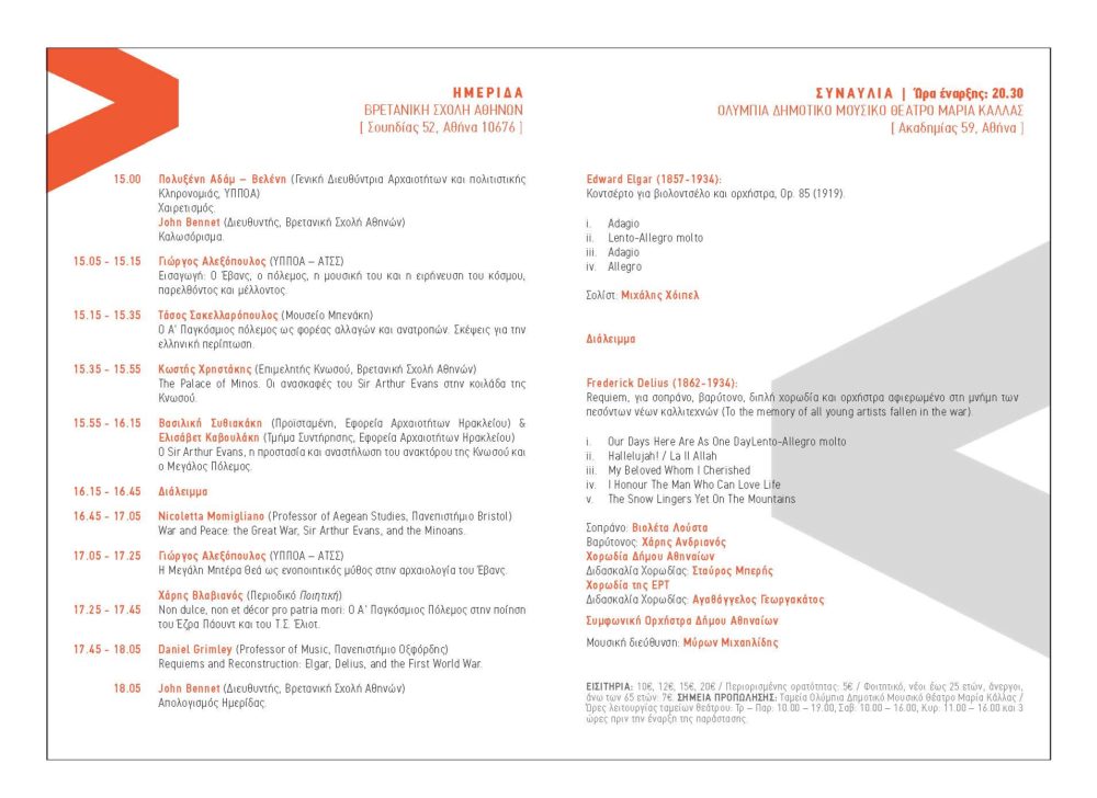 Ο Sir Arthur Evans, ο Μεγάλος Πόλεμος και η ειρήνευση του μινωικού πολιτισμού ( British School at Athens, Upper House, workshop between 3.00 pm – 6.15 pm and at 8.30 pm the concert will take place at the Olympia Municipal Music Theatre Maria Callas)