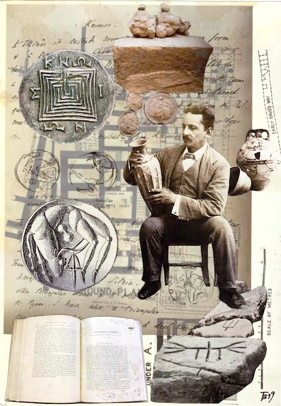 The excavation of Knossos, one of the most important sites of the ancient world, is inextricably linked with Sir Arthur Evans. Evans discovered the ruins of a monumental complex and the remains of a hitherto unknown civilization, formulating the prevailing view of it. Inspired by Evans’ work, artist Teresa Valavani has created a collage collection entitled Dancing with the Bull: Sir Arthur Evans and the palace of Knossos, to be exhibited in the garden of the Knossos Research Centre of the British School at Athens, Villa Ariadne, Knossos. The exhibition will be presented by Honorary Ephor of Antiquities Dr Andonis Vasilakis.