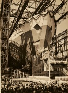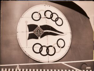 images left to right: Aristotle Onassis in the 1930s. Source: Onassis Archive. The logo of the Onassis shipping company on the chimney of Tina Onassis. Source: Onassis Archive. Launching of the tanker Tina Onassis, 25 July 1953. Source: Onassis Archive