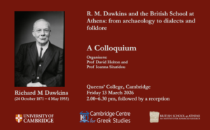 which will focus on the life and work of Richard M. Dawkins, Director of the British School at Athens (1906 to 1914) and the first occupant of the Bywater and Sotheby Chair of Byzantine and Modern Greek Language and Literature at the University of Oxford (1920–1939).