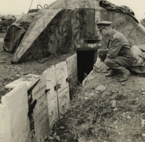 image: German gun-emplacement at Thessaloniki with its communication trench lined with Jewish gravestones. Photographed by the British Army in November 1944. Author’s archive.