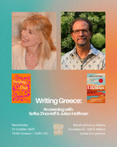 Neither Julian Hoffman nor Sofka Zinovieff are originally from Greece and yet they’ve both devoted a large part of their careers to writing and thinking about this country. Between them, they’ve explored it in novels, nonfiction, short stories, podcasts and essays. One lives in Athens, the other in Prespa – but much connects them. Please join us for an evening of conversation that brings together these two acclaimed and award-winning authors around their shared fascination for their adopted homeland. They’ll talk about their latest books – Sofka’s Stealing Dad and Julian’s Lifelines – and how they’ve been inspired, challenged and changed by writing about Greece.