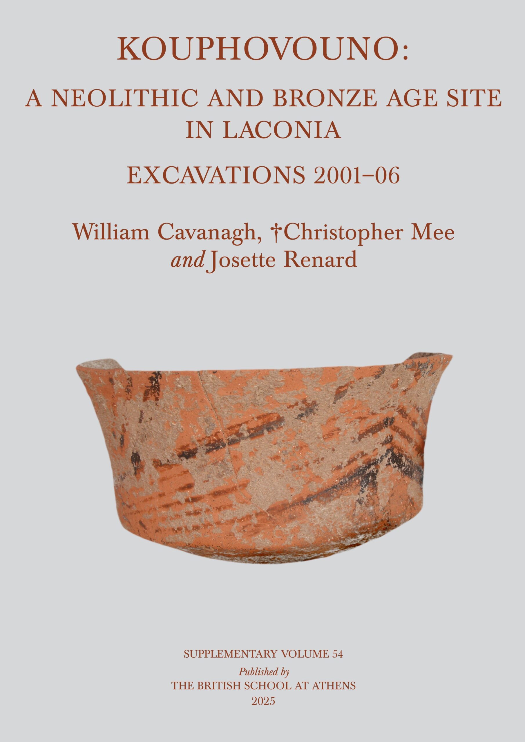 Kouphovouno: A Neolithic and Bronze Age Site in Laconia. Excavations 2001–06. By William Cavanagh, †Christopher Mee, and Josette Renard. BSA Suppl. Vol. 54. London 2025. 486 pp (with 224 figures and 16 tables in text) + 40 pp plates (28 b/w + 12 colour). ISBN 978-0-904887-76-1.