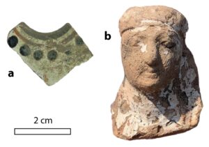 White-slipped, Archaic finds from 2023 fieldwalking, probably of 6th century BCE Chian manufacture: (a) fragment of a wine jug, (b) head of a painted female figurine.