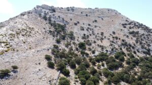 Two trenches were excavated in Area D based on surface remains already mapped in 2022. Trench D.1 contained three walls, two bonded together, giving insight into the development of the terracing system. Finds of Early Byzantine date (8th century CE) included amphora fragments and a quern. One certain and one possible cist burials were detected but not excavated. In Trench D.2, 16m to the north of D.1, excavation of three surface features revealed a possible platform or enclosure within which was set a cist tomb. The cist was partially excavated revealing one articulated burial and a second displaced burial. The grave featured a tombstone with an incised cross.