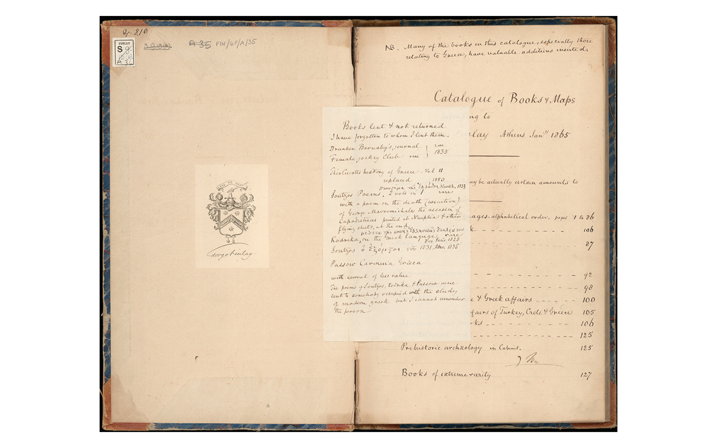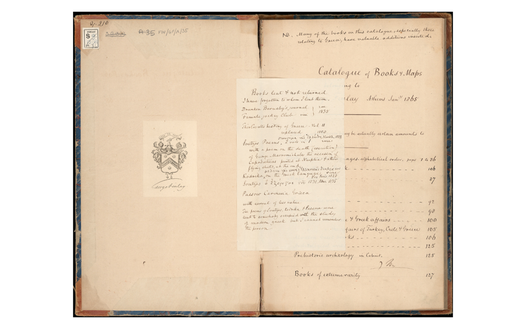 The George Finlay Collection was presented to the British School at Athens in 1899, by Mr. William Henry Cooke, George Finlay’s nephew and his sole surviving executor. It quickly became the nucleus of the School’s library, archive and museum collection and has provided a rich source of information. The Finlay Room, the common room in the School’s hostel, houses part of Finlay’s own library.