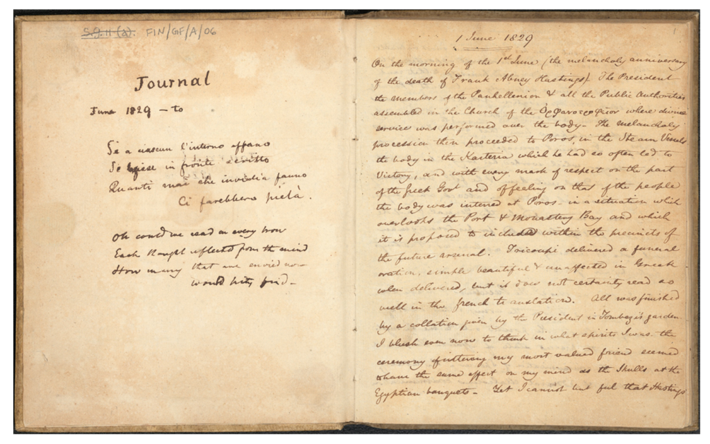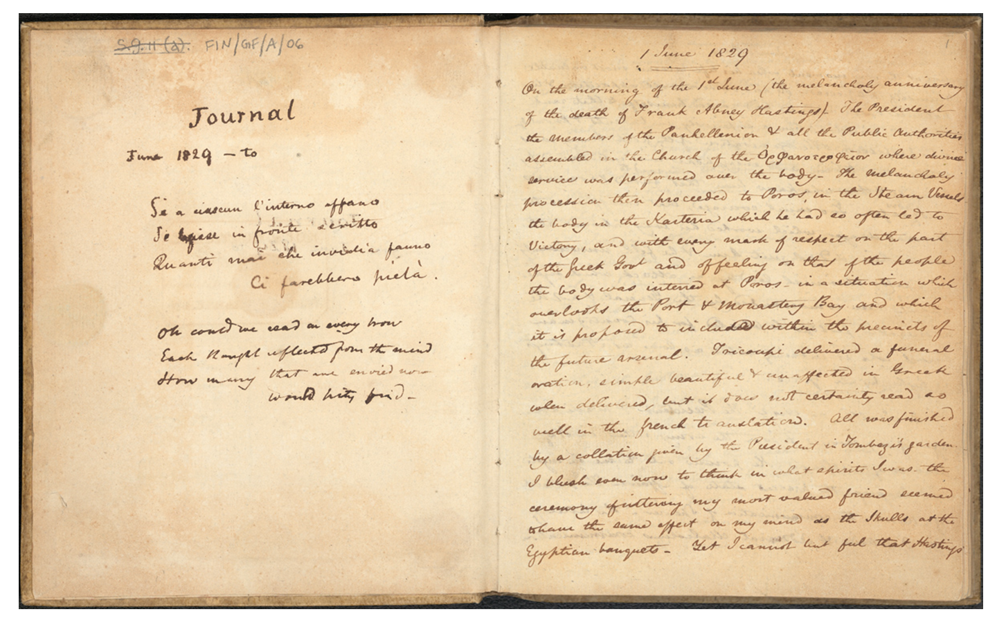 The Finlay archival collection contains notebooks, personal journals, personal and official correspondence spanning a period of fifty years, for Finlay kept meticulous records of his travels, personal acquaintances and expenditure, copious memoranda on strategy and on military and political organisation, journal entries, maps, facetiae, scrapbooks, personal notes on people—Greeks and others—and on revolutionary events, as well as newspaper cuttings mainly on Greece and international affairs. It also contains corrected proofs of Finlay’s published works including the original manuscripts of the History of the Greek Revolution (1861).
