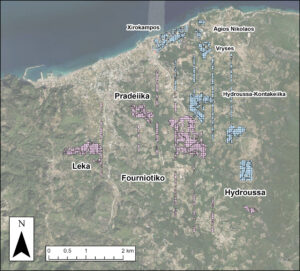 In northwest Samos, other patterns emerged. Byzantine pottery is abundant in the area of Xirokampos, located at the site of the island’s old leper hospital directly on the coast and east of the town of Karlovasi. A fair amount of ancient material was also collected from here but is thought to have been redeposited in the area through the agricultural practice of armakas construction. Further inland and west of the Fourniotiko river, an area of high density Archaic–Hellenistic material was found. The diagnostic pottery collected includes significantly more tableware pieces than those collected in southwest Samos, and different shapes, too. Prehistoric stone tools was collected around Fourniotiko. Medieval–modern pottery was collected in the environs of Leka and Hydroussa villages, both areas frequently mentioned by interlocutors in the ethnographic survey.